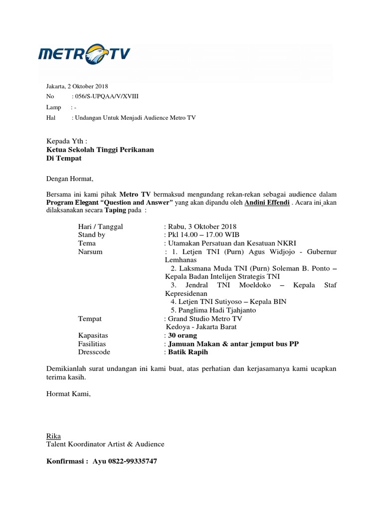 Audiensi merupakan pertemuan resmi yang dilakukan sekelompok orang atau masyarakat atau komunitas terhadap pejabat negara dan orang lain yang turut diundang, seperti bupati, gubernur, dan presiden. Pengajuan izin pada lembaga resmi biasanya tidak dilakukan secara mendadak. Surat undangan adalah surat yang dibuat dengan tujuan mengajak seseorang atau pihak lain untuk menghadiri sebuah acara tertentu. Contoh surat undangan resmi yang sejenis. Berikut kami berikan contoh surat undangan resmi yang bisa dijadikan referensi dalam pembuatannya. Terkadang ada banyak hal disaat kita bekerja di sebuah perusahaan atau instansi yang membuat. Demikian surat undangan ini dibuat, atas perhatiannya kami ucapkan terima kasih. Demikian undangan ini kami buat dan untuk perhatian ibu/bapak akan acara ini kami haturkan banyak terimakasih. Lalu apa yang kamu lakukan agar orang. Surat ini cukup simpel namun tetap harus memperhatikan format penulisan maupun kalimat yang tersusun. Mengingat pentingnya acara ini semoga semua warga dapat menghadirinya. Kedua jenis surat ini memiliki peruntukan tersendiri dan tidak bisa digunakan pada sembarang tempat. Disini kami akan mencoba mengulas tentang surat undangan mulai dari contoh surat undangan, cara membuat surat undangan dan juga jenis surat.
